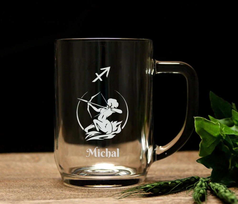 Ručně pískovaný půllitr se znamením zvěrokruhu STŘELEC a jménem na přání.