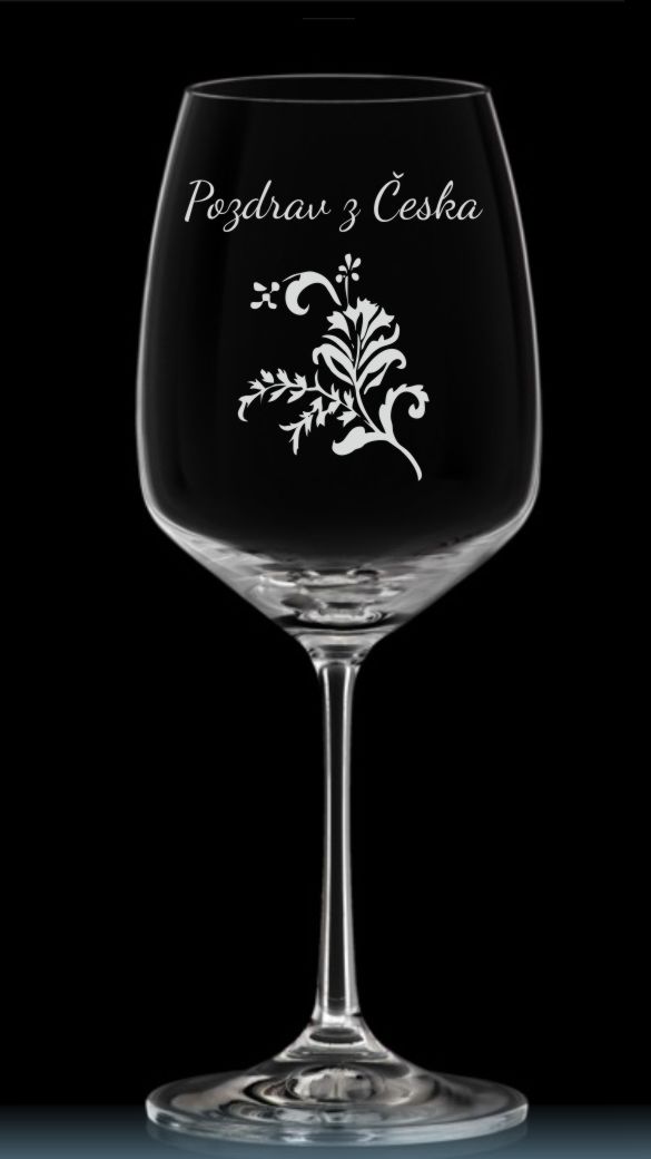 Sklenice na víno Giselle 455 ml s pískovaným květinovým motivem a nápisem Pozdrav z Česka.