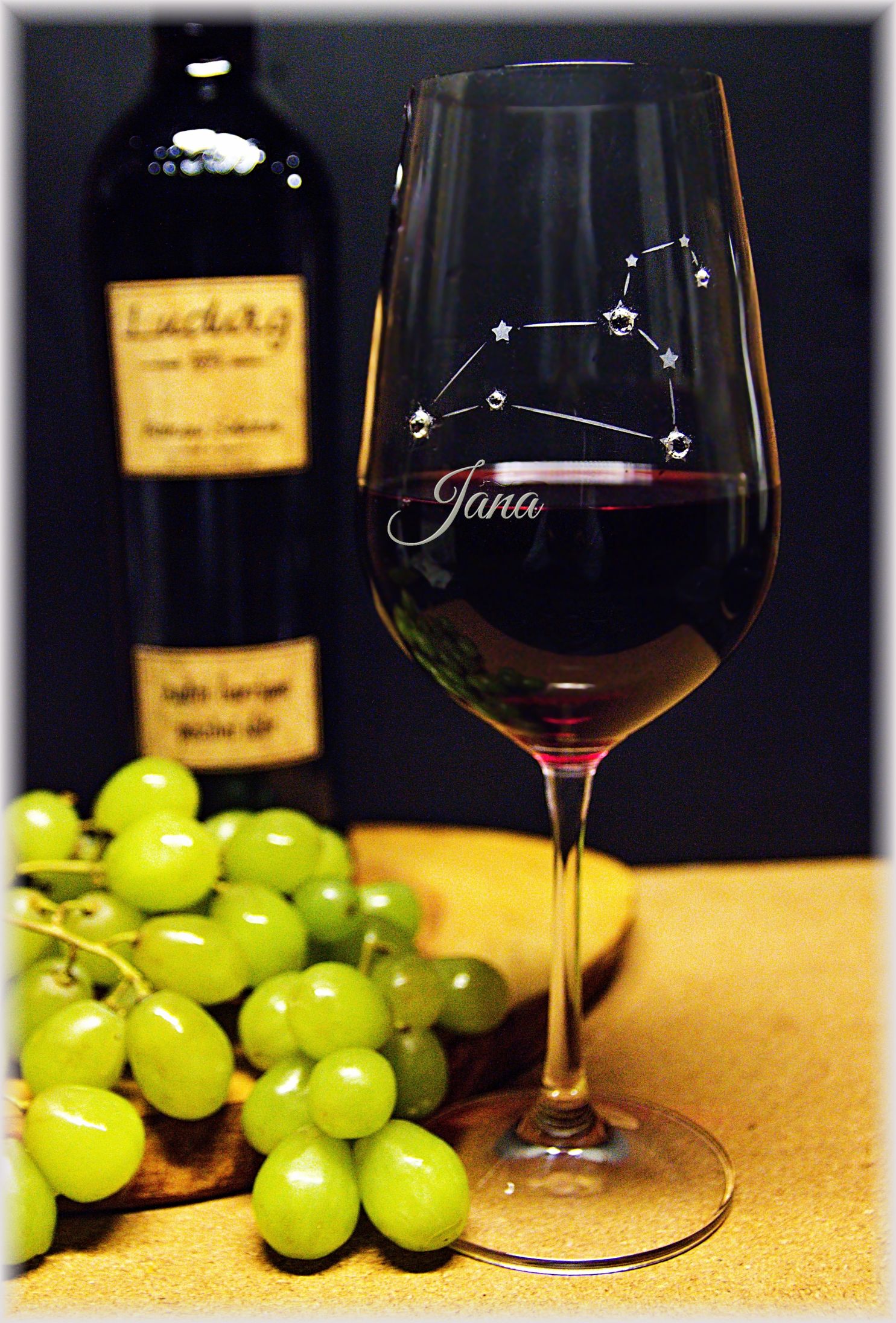 Sklenice na víno z křišťálového skla, s ručně pískovaným motivem souhvězdí a dekorované 5 kameny SWAROVSKI®ELEMENTS, pískovaným jménem na přání. Velikost krystalů jsou citlivě zvoleny podle záře hvězd v jednotlivých souhvězdích. Pro souhězdí LEV jsou 3 krystaly větší a 2 menší.